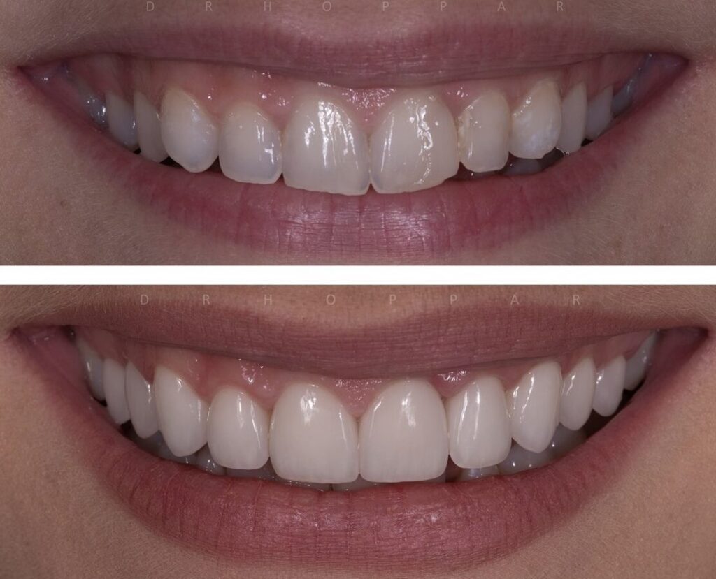 1. Kizárólag 2 db kerámia héj készült a két kismetsző fog korrigálására, így a természetes fogaktól megkülönböztethetetlen színű és formájú héjak készültek.